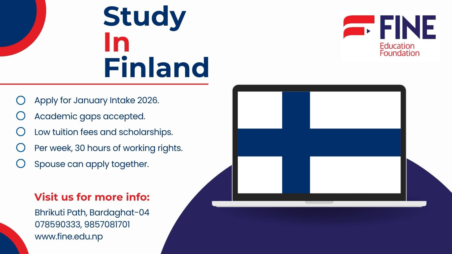 Since our inception, we have been on a journey to become a top consultancy in Nepal, aiming to achieve this by providing unmatched services to our students. At Fine Education, we carefully assess your needs and offer the best solutions tailored to your requirements. Our global footprint includes countries like Australia, Japan, New Zealand, the USA, Canada, the UK, Finland, Malta, and the Czech Republic, with many other countries, and you will understand that Fine Education is a class apart from everyone else. Our key role is to bridge the gap between students and their study destinations by providing guidance, support, and knowledge.